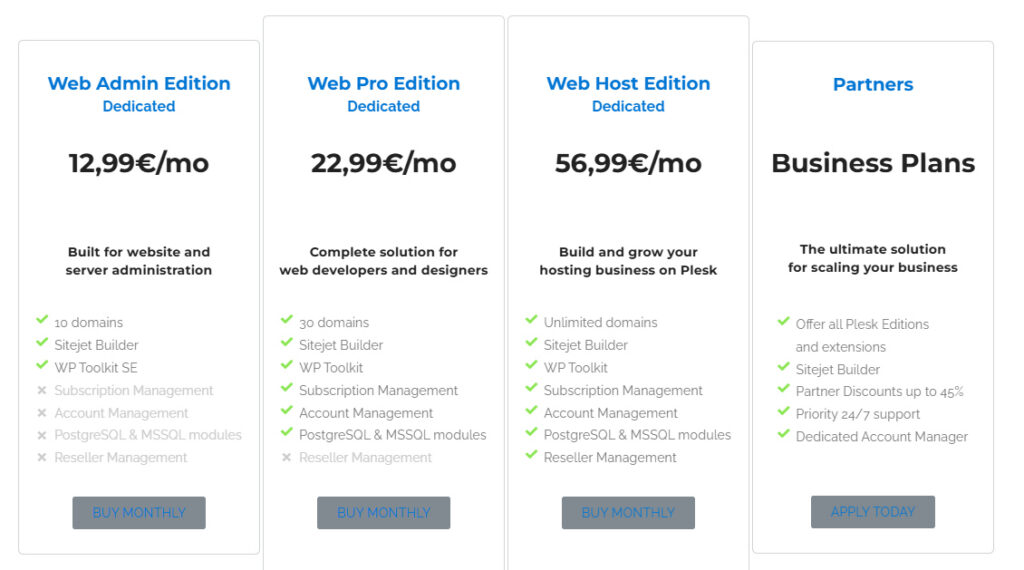 Die Web Admin Edition für Dedicated Server ist die Einstiegslizenz und kostet 11,91€ pro Monat (regulär 12,99€). Sie ist gedacht für Website- und Server-Administration mit bis zu 10 Domains.